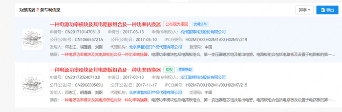 据企查查,富特科技在2017年先后申请了一种电源功率模块及其电路板组合及一种功率转换器的实用新型专利和发明专利,其中实用新型专利在2017年11月取得公告,发明专利在今年6月21日法律状态变更为“发明专利申请公布后的视为撤回”。