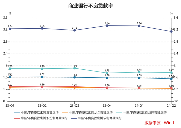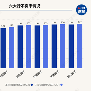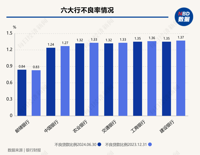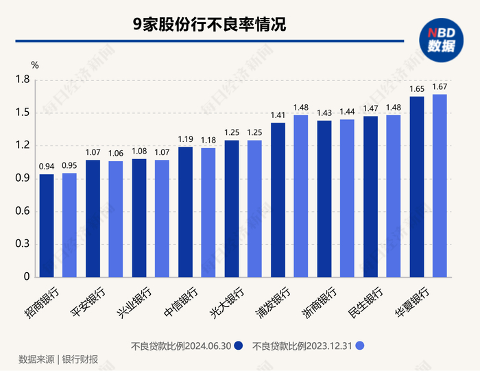 分银行性质看,6家大型国有银行不良贷款率区间为0.83%~1.35%,下限为邮储银行0.83%,上限为建设银行1.35%,上下限差距为0.52个百分点。9家股份制银行不良贷款率区间为0.94%~1.65%,下限为招商银行0.94%,上限为华夏银行1.65%,上下限差距为0.71个百分点。