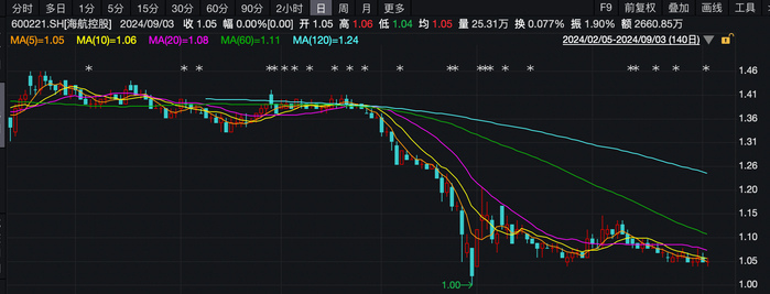 尽管如此,公司似乎还没有回到足够安全的轨道。7月份至今,海航的股价一直徘徊在1元生死线之上。