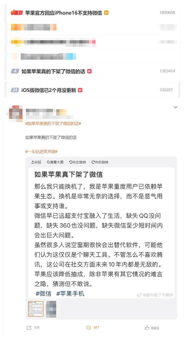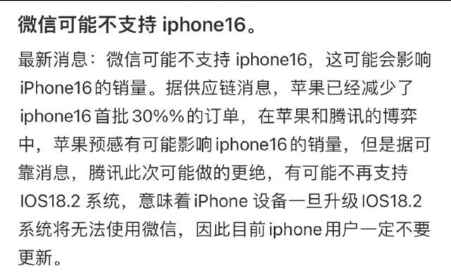 9月2日,网上有传言称,微信可能不支持iPhone 16,并提醒用户一定不要更新系统。