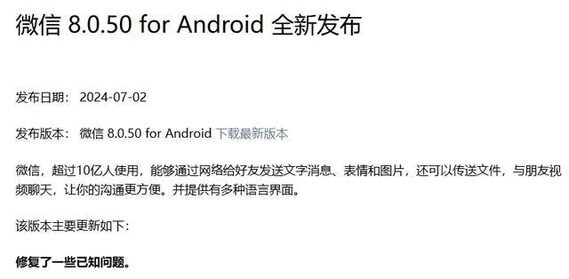其实,通过微信官网查询可知,目前安卓和iOS版微信版本号是完全同步的,都是8.0.50,而且都是在7月2日发布。