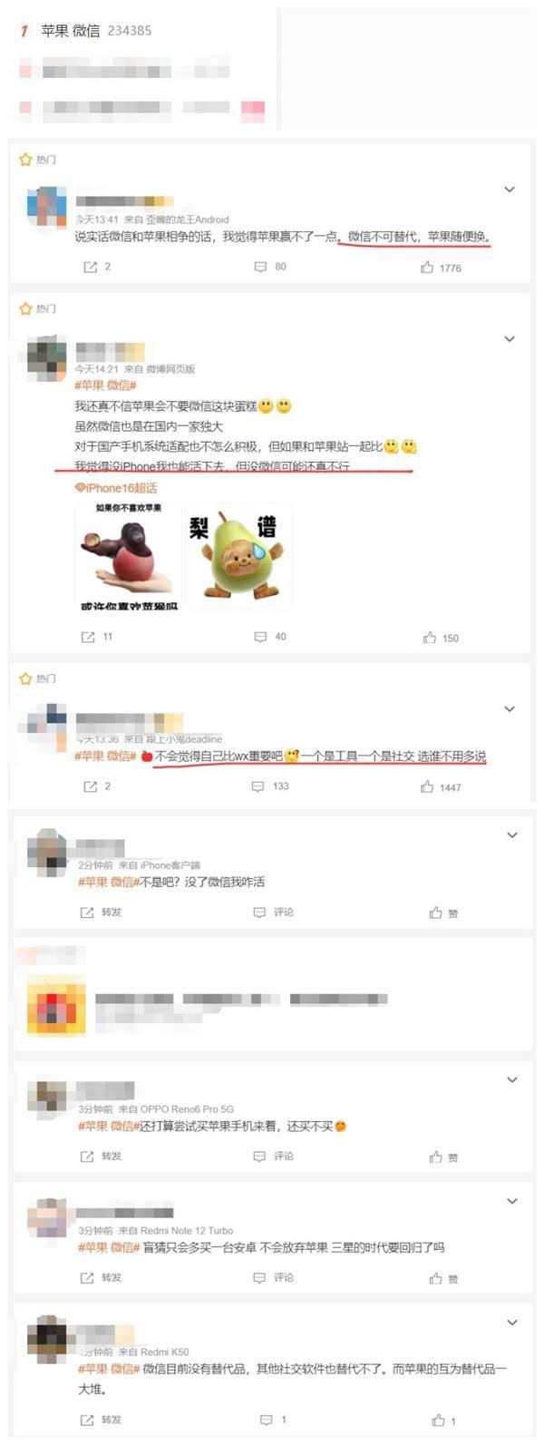 在评论区,也有不少网友表示“支持微信”,在部分网友看来,微信具有不可替代性,但苹果可以被替代。