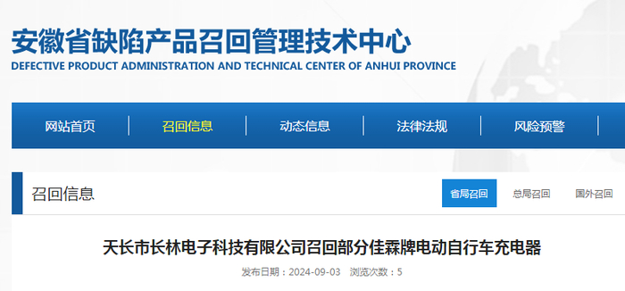 【安徽】天长市长林电子科技有限公司召回部分佳霖牌电动自行车充电器