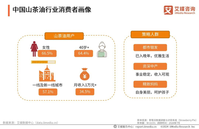 iiMedia Research(艾媒咨询)数据显示,中国山茶油的消费者中,女性消费者占比达66.5%,男性消费者占比为33.5%;有34.5%的山茶油消费者月收入在1万元以上,57.1%的消费者分布于一线及新一线城市。中国山茶油市场的策略人群主要为都市银发、资深中产和精致妈妈,通过精准定位、产品创新和数字化营销,山茶油品牌可以更好地满足消费者的需求,实现品牌在山茶油市场的快速发展。