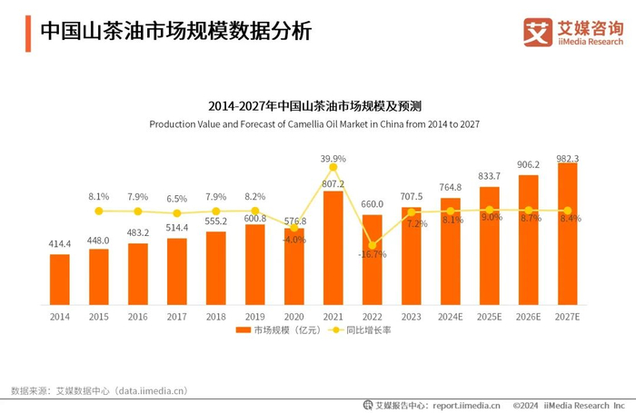 iiMedia Research(艾媒咨询)数据显示,中国山茶油市场整体呈上升趋势,2023年中国山茶油市场规模达707.5亿元。艾媒咨询分析师认为,随着经济的发展和人民生活水平的提高,消费者对高档优质食用油的需求量快速提升,茶油作为健康食用油的代表,其市场需求持续增长。同时,国家相关部门高度重视油茶产业的发展,将其纳入国家发展战略,预计2027年中国山茶油市场规模有望达982.3亿元。