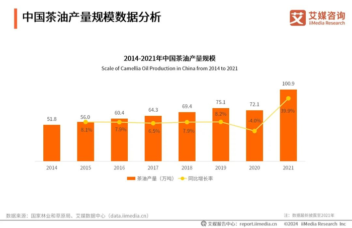 数据显示,自2014年来,中国茶油产量呈现逐年增长态势,2021年中国茶油产量达到100.9万吨,同比增长39.9%。整体来看,中国山茶油行业处于一个稳定且持续发展的阶段。政府对农业发展的持续支持和对优质茶油生产的重视,为茶油行业的发展提供了坚实的保障,预计中国茶油市场将进一步扩大。