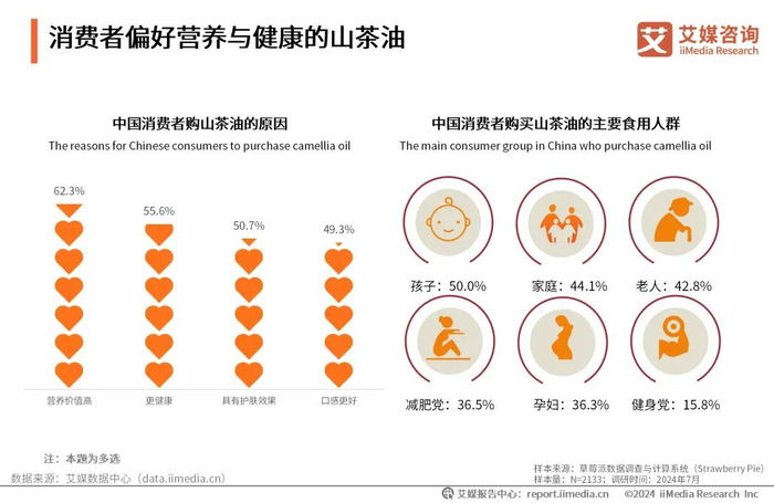 iiMedia Research(艾媒咨询)数据显示,消费者购买山茶油的原因主要基于其营养价值高(62.3%)和更健康(55.6%)的特点;消费者购买山茶油主要是为了家中孩子、家庭、老人等。山茶油以其卓越的营养价值和健康益处,成为适合小孩、老人、孕妇、三高人群等各类人群的理想食用油。