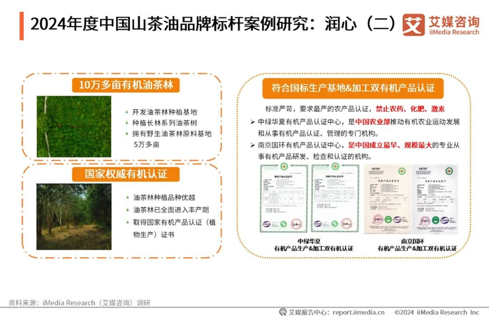 润心以发展油茶产业为己任,坚持走原产地资源和农副产品深加工企业的道路。除开发种植油茶林种植基地外,润心还拥有野生油茶林原料基地5万多亩,合计共有有机油茶林10万多亩。在质量管控方面,润心荣获中绿华夏有机产品认证中心和南京国环有机产品认证中心的生产基地和加工双有机农产品认证,彰显了其在食品安全生产与质量管理领域的市场地位。