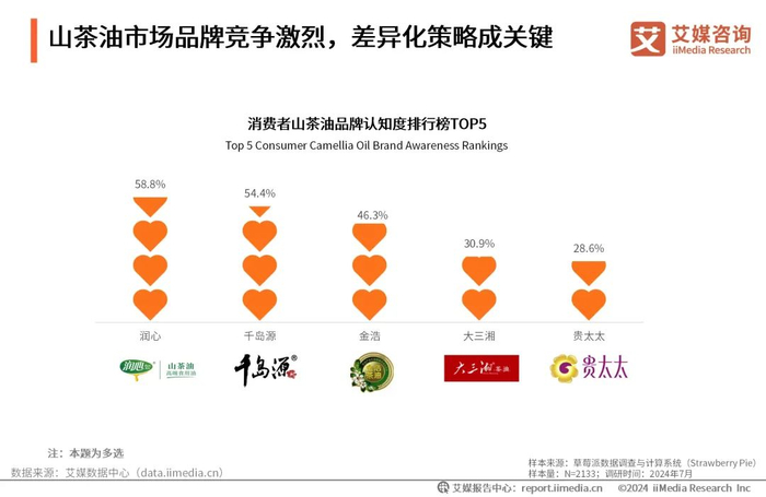iiMedia Research(艾媒咨询)数据显示,在山茶油品牌认知度上,排名前五的品牌依次为润心、千岛源、金浩、大三湘、贵太太。山茶油市场的品牌竞争日益激烈,各品牌需要审视自身的市场定位、营销策略以及产品特色,寻找与竞争对手的差异点,并通过有效的市场传播手段提升品牌知名度,从而在市场中占据有利地位。