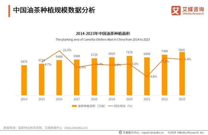 数据显示,中国油茶种植面积不断扩大,从2014年的5475万亩发展到2023年的7865万亩,呈现出稳步增长的趋势。中国油茶产业在油茶产业发展项目、农业发展资金、现代农业发展扶持资金等多方面的强力支持下,展现出良好的发展态势。未来,在政策支持和市场需求的双重推动下,中国油茶产业有望迎来更广阔的发展前景。