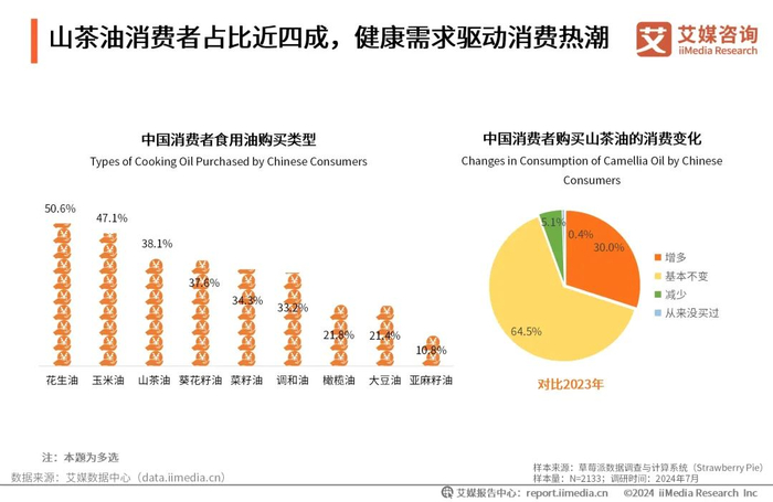 iiMedia Research(艾媒咨询)数据显示,在多种食用油类型中,山茶油以其独特的魅力吸引了38.1%的消费者。对比2023年,大部分消费者在山茶油上的消费增加或保持不变。随着健康意识的普及和深化,人们越来越注重饮食健康与营养的均衡,消费者对健康食用油需求的持续攀升,是山茶油市场份额稳步提升的关键驱动力。