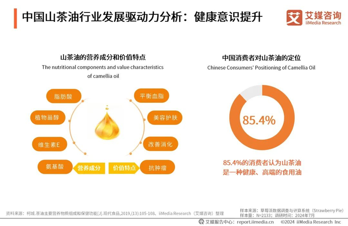 iiMedia Research(艾媒咨询)调研数据显示,超过八成的消费者认为山茶油是一种健康、高端的食用油。随着消费者对健康食品的需求不断提升,山茶油作为一种优质食用油,富含不饱和脂肪酸、维生素E、植物甾醇和多种氨基酸,具有平衡血脂促进心血管健康、美容护肤延缓衰老、抗肿瘤和改善消化功能的作用。因其多方面的健康优势,山茶油正逐渐成为消费者追求健康饮食的重要选择。