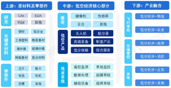 低空经济涉及众多产业链,上游为原材料与核心零部件领域,研发包括各种工业软件,原材料包括 钢材、铝合金、高分子材料等,零部件包括芯片、电池、电机等;产业链中游包含无人机、 航空器、高端装备、配套产品、低空保障与综合服务;衔接下游需要有飞行审批、空域备案等,通过后的下游应用是低空经济与各种产业的融合。