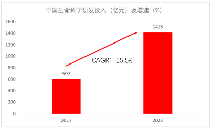 生命科学领域涵盖制药、生物技术、医疗器械、诊断和其他相关领域的广泛业务。得益于制药、生物科技、医疗科技的快速发展,推动了生命科学市场的扩容,2023年全球总体市场规模达到了2.83万亿美元,中国生命科学市场规模2022年为1.21万亿元,预计2028年将达到2.82亿元,复合增速约为15%。研发投入方面,据相关研究报告数据统计,2017年全球生命科学领域研发投入为1,332亿美元,并逐年增长至2023年的1,868亿美元,复合增速为5.8%。中国2017年投入生命科学领域的研发资金为597亿元,并逐年增长至2023年的1,415亿元,复合增速达15.5%,增速远高于全球平均水平。