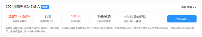 9月3日,据天津银行披露,该行发行的2024年港湾财富247期封闭式净值型理财产品-A募集期为2024年9月3日起至2024年9月9日止,初始计划发行量12亿元,首次认购起点金额1万元。产品内部评价为中低风险,期限为723天,产品类型为固定收益类,业绩比较基准为2.80%-3.63%(年化)。