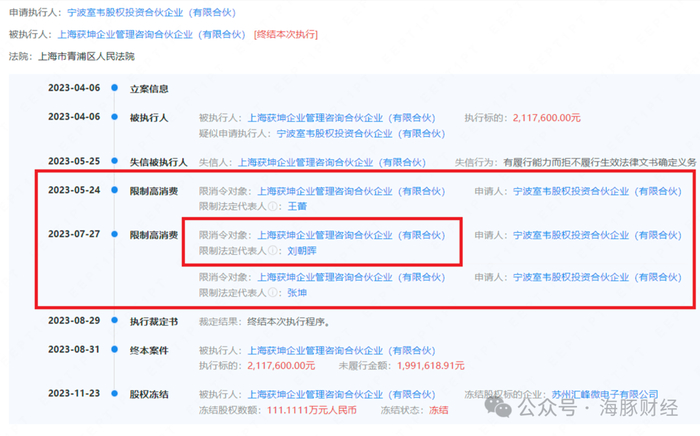 不过,众捷汽车没有披露的是,刘朝晖还曾有另一个身份,他曾经在威马汽车的投资部门任职。根据(2023)沪0118执5009号执行案件,被执行人上海获坤企业管理咨询合伙企业法定代表人刘朝晖2023年7月被法院限制高消费。
