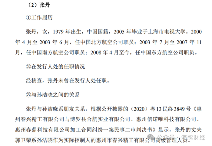 孙洁晓的另一名代持人张丹则是一名空姐。张丹1979年出生,2005年毕业于上海市电视大学。2000年4月至2003年6月任中国北方航空公司职员;2003年7月至2007年11月任中国南方航空公司职员;2008年4月至今任中国东方航空公司职员。张丹的丈夫郭卫荣系孙洁晓作为实际控制人的惠州市春兴精工有限公司的高级管理人员。企查查显示,张丹与丈夫郭卫荣担任股东或法定代表人的多家公司被列入失信名单,两人均被法院限制高消费。