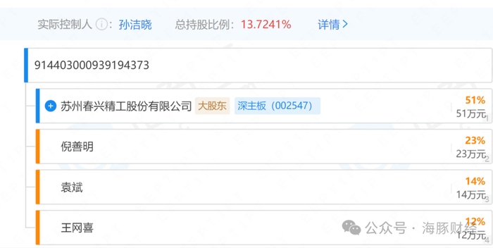 具体看,代持人之一王海燕1974年出生,1996年毕业于上海师范大学。1996年至今任上海市育民中学教师。王海燕与孙洁晓没有直接关系,但王海燕的的丈夫袁斌与孙洁晓存在共同投资关系,袁斌系孙洁晓作为实际控制人的深圳春兴数控设备有限责任公司的股东,袁斌持有该公司14%的股权。
