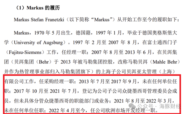 海豚财经曾就Markus在马勒贝洱(Mahle Behr)的具体职位向众捷汽车核实,后者回复称,“经我公司向Markus本人确认,Markus在贝洱亚太的职务系采购经理,不存在虚假披露的情形。”
