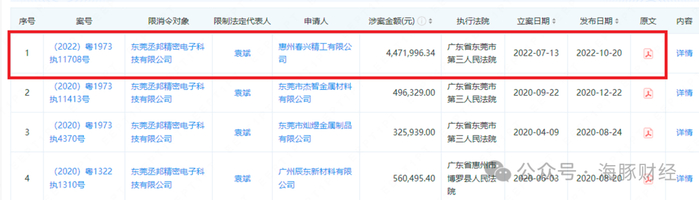 值得注意的是,袁斌担任大股东、负责人的多家公司因诉讼被列入失信被执行人,袁斌也被法院限制高消费。诡异的是,孙洁晓旗下的惠州春兴精工也将袁斌掌控的东莞丞邦精密电子科技有限公司告上法院并申请强制执行。