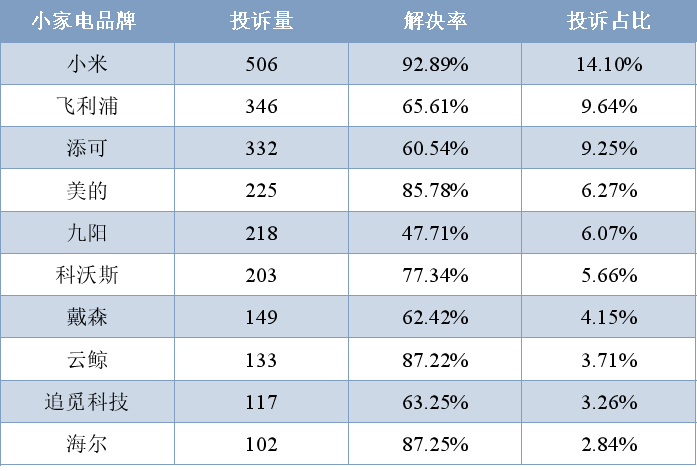 据统计,小米超越传统小家电品牌,投诉量排第一,解决率高达92.89%;飞利浦、添可、美的、九阳、科沃斯等品牌也位于榜单前列。