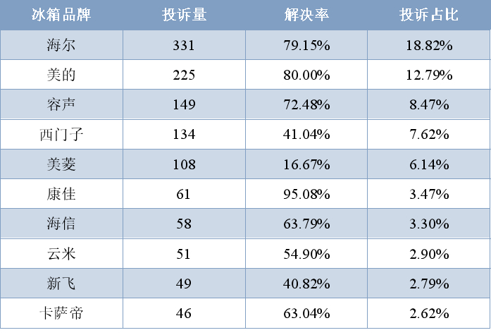 冰箱品牌相关投诉中,海尔、美的、容声冰箱投诉量分别为331件、225件、149件,三者占总投诉量的40%。