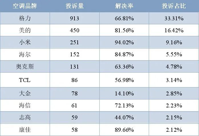 空调相关投诉中,格力以913件投诉稳居第一,占比高达33.31%;美的次之,占比为16.42%;小米投诉占比为9.16%,排第三。在投诉解决率方面,小米、康佳、海尔、美的空调均超80%,而大金、志高、TCL等品牌的投诉处理效率有待提升。