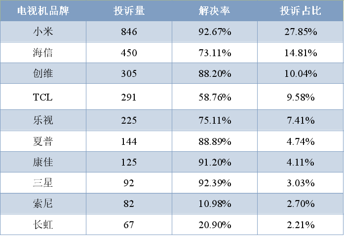 在电视机品牌投诉中,小米电视以27.85%的投诉占比位居第一,解决率达92.67%;海信电视投诉占比为14.81%,排第二,解决率为73.11%;创维电视投诉占比为10.04%,解决率为88.20%。与此同时,TCL、夏普、康佳等品牌的投诉也较为靠前。