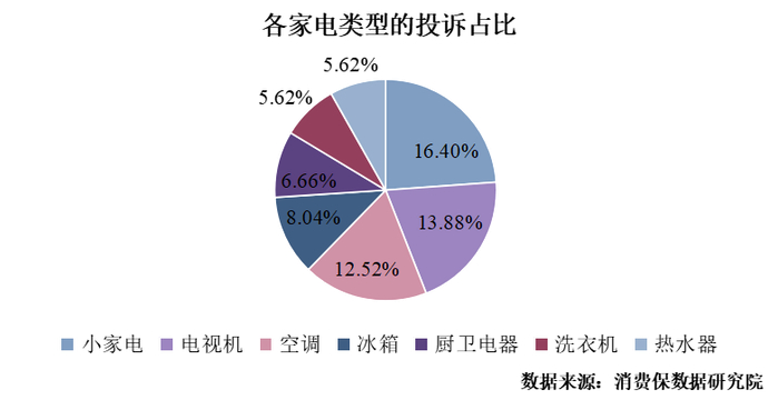 消费保平台家电行业相关投诉中,小家电、电视机和空调的投诉量位居行业前三。其中,小家电的投诉量为3,589件,占比为16.40%;电视机的投诉量为3,038件,占比为13.88%;空调以12.52%的投诉占比排第三。