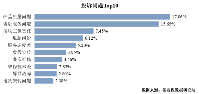 其中,产品质量问题以17.06%的占比位居榜首,售后服务问题占比为15.65%,排第二。