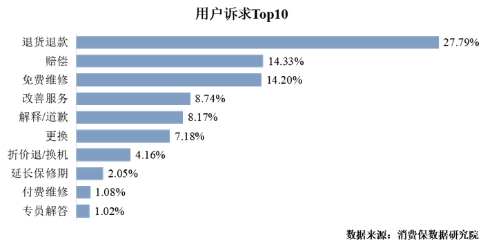 家电行业消费者诉求中,要求退货退款的投诉占比最高,为27.79%;要求赔偿的次之,占比为14.33%;此外,免费维修、改善服务、解释/道歉等诉求也位居诉求榜前列。