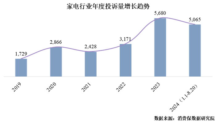 2019年家电投诉量为1,729件,2020年上升至2,866件,同比增长65.76%;2021年家电投诉量出现小幅度下滑,随后呈现出稳步上升趋势,其中2023年投诉量为5,680件,同比增长79.12%,涉诉金额为1,820万;2024年1月以来的累计投诉量为5,065件。