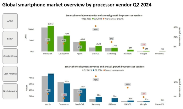 近日市场研究机构Canalys发布了2024年第二季度(4-6月)全球智能手机处理器厂商出货量情况,来看看各家表现如何~