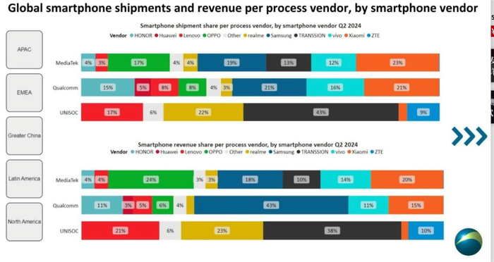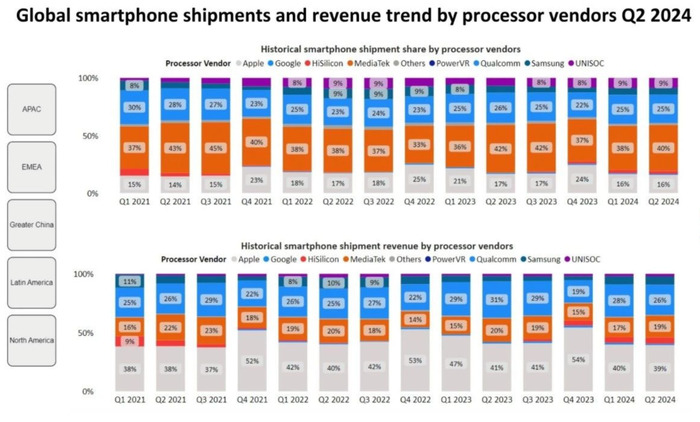 Canalys数据显示,2024Q2全球处理器出货量份额排名依次是:①联发科 40% ②高通25% ③苹果 16% ④紫光展锐 9%;⑤三星Exynos ⑥海思 ⑦谷歌。收入来说TOP 3依次是:①苹果(收入占比39%) ②高通(26%) ③联发科(19%)。