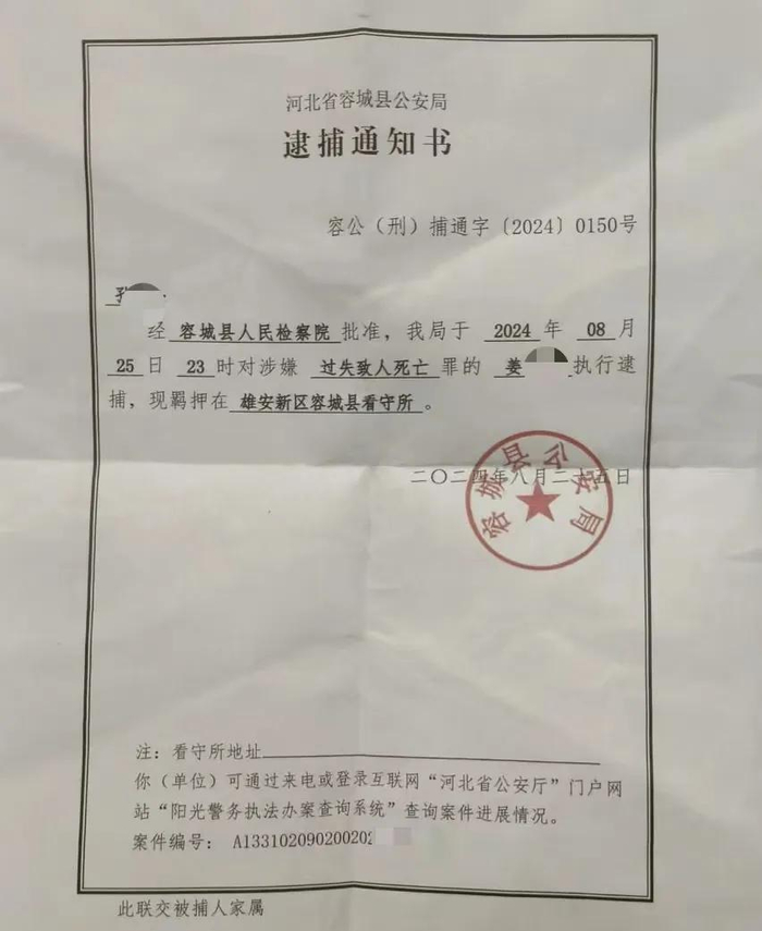 8月25日,家属收到了姜某被逮捕通知书,该通知书显示,经容城县人民检察院批准,对涉嫌过失致人死亡罪的姜某执行逮捕,现羁押在雄安新区容城县看守所。