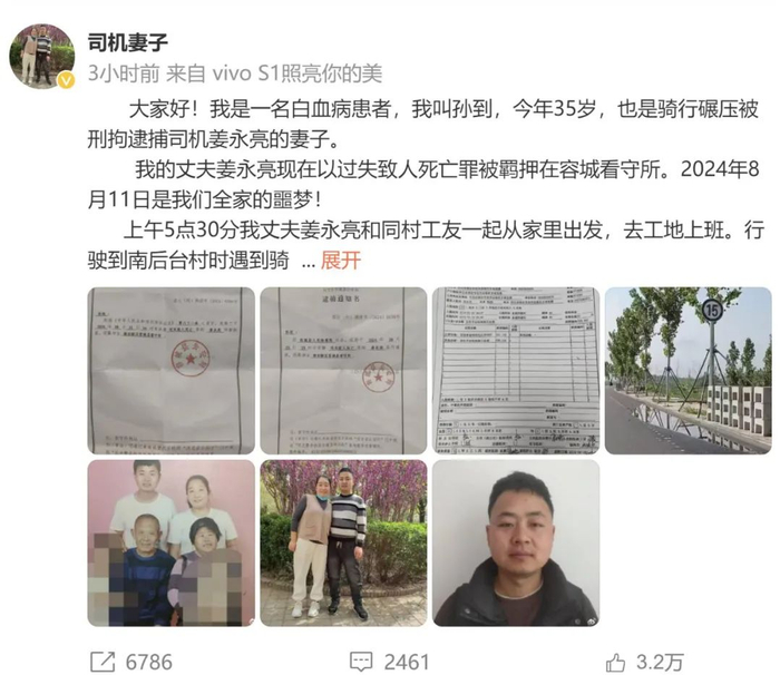 今天傍晚,肇事司机的妻子也通过微博发声: “我是一名白血病患者,今年35岁……现在,我家已经雪上加霜,两个未成年的孩子,两位70来岁的父母,母亲有一只眼看不到……已聘请律师周兆成代理我老公的案件……”
