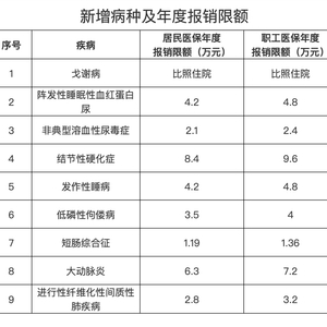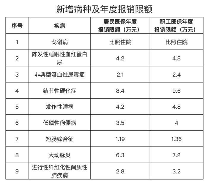 一、扩大病种保障范围。为保障参保患者长期门诊治疗需求,根据国家医保药品目录新增药品情况,在组织专家咨询论证的基础上,决定将戈谢病、结节性硬化症、低磷性佝偻病等9种疾病新增纳入我省基本医保门诊慢特病病种保障范围。全省执行统一的病种编码、认定标准和医保基金年度最高支付限额。参保患者经临床专家鉴定符合病种认定标准的,可按规定享受慢特病门诊医疗保障待遇。