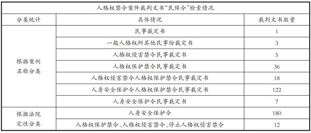 其二,案件指代和案件名称。根据《最高人民法院关于确定人身安全保护令案件及其类型代字的通知》(法〔2016〕37号),人身安全保护令审查案件类型代字为“民保令”。因此,无论从司法解释还是文字内容来看,“民保令”即指申请人身安全保护令的案件。而目前所有人格权禁令案件,虽然可能是侵害名誉权、隐私权等具体人格权和住宅安宁权等一般人格权的情况,但法院仍将一律案号设定为“民保令”形式。对于诉中禁令,有的法院以“民保令”指代,有的法院则以民事案件一审程序案号指代。案件命名同样比较混乱。例如,有1例案件本身涉及法人名誉权侵权行为,并非家庭成员之间实施暴力的情形,当事人同样申请的是人格权侵害禁令,但法院仍将案件命名为“人身安全保护令申请审查民事裁定书”。