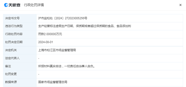 因此,上海市松江区市场监督管理局于8月1日作出对其罚款2万元的行政处罚。