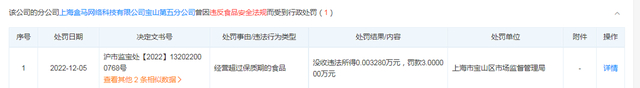 然而,盒马鲜生的“过期门”事件却并没有停止,2022年12月,上海盒马网络科技有限公司宝山第五分公司因经营超过保质期食品被上海市宝山区市场监督管理局罚款3万;今年4月23日,其徐汇第一分公司也因经营超过保质期食品被罚没约0.6万元……