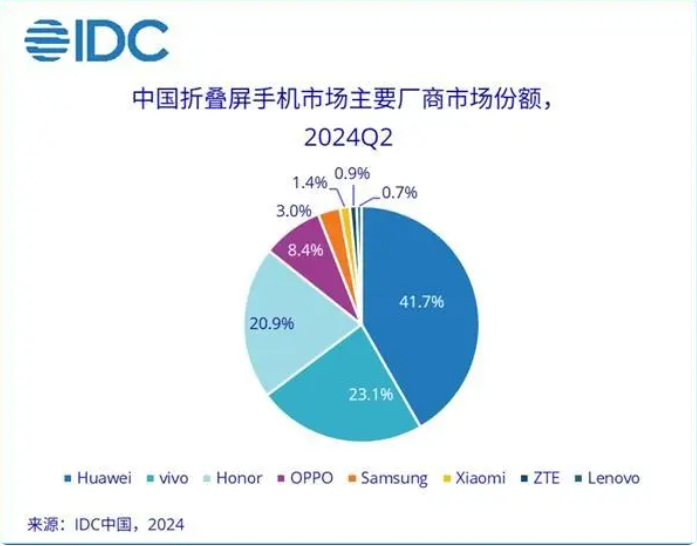 IDC近期发布2024年第二季度中国折叠屏手机市场报告显示,华为凭借41.7%的市场份额排名第一,vivo、荣耀分列第二、三名。
