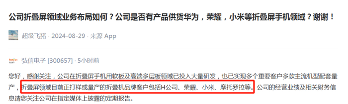 比如,有投资者在互动平台询问弘信电子,在折叠屏领域的业务布局情况,是否有产品供货华为、荣耀、小米等厂商的折叠屏手机。