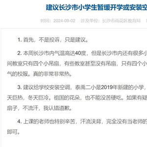 9月2日,在湖南日报旗下网站华声在线“湘问·投诉直通车”栏目,一位网友向长沙市雨花区教育局留言:建议长沙市小学生暂缓开学或安装空调,以免学生中暑。
