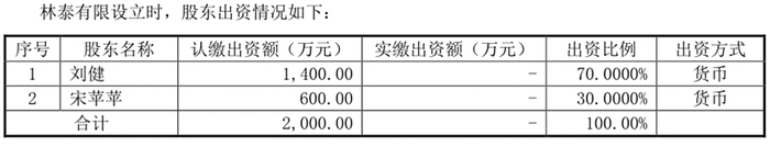 2016 年 10 月,刘健分别将林泰有限27.1429%的股权及42.8571%的股权转让给宋苹苹与王梓宇,由于注册资本尚未实缴,转让价格均为0元。