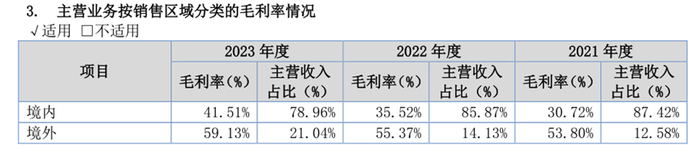境内毛利率低于境外,毛利率变动趋势异于行业