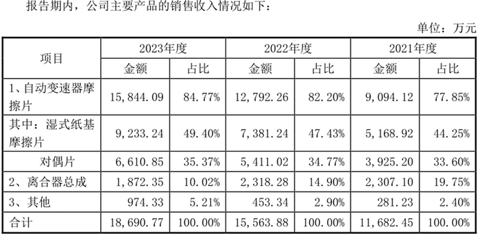 2021年-2023年,林泰新材主营业务收入分别为1.17亿元、1.56亿元和1.87亿元。其中来自湿式纸基摩擦片的销售收入分别为5,168.92万元、7,381.24万元及9,233.24万元,占比主营业务收入的44.25%、47.43%及49.40%,湿式纸基摩擦片销售为公司最主要的收入来源。