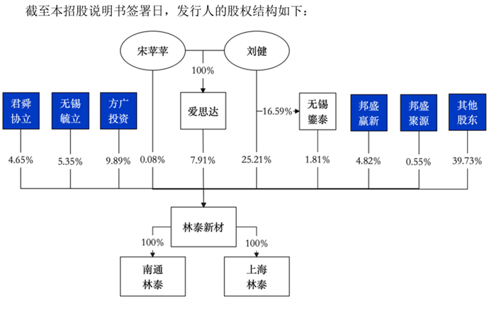 截止递表,刘健直接持有林泰新材25.21%,并通过爱思达间接控制林泰新材7.91%的股权,通过无锡鎏泰控制林泰新材1.81%,合计控股34.93%,为公司控股股东。