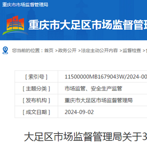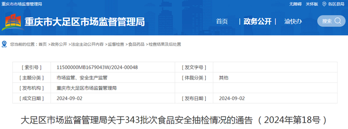 重庆市大足区市场监督管理局关于343批次食品安全抽检情况的通告 (2024年第18号)