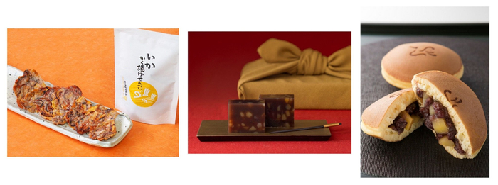 日式点心区您可以感受到日本的“传统”和“美感”,有传统方法制作的铜锣烧和羊羹,也有活用食材且制作方法新意十足的水果大福和仙贝等,各种各样一应俱全。其中推荐的是“越前海鲜俱乐部”炸鱿鱼仙贝50g(如图左),咀嚼时鱿鱼的鲜美味道会在口中充分散开,在酒店当夜宵点心也很适合!还有“鹤屋吉信”栗子羊羹(如图中)、“鹤屋八幡”栗子舞鹤(如图右)等秋季限定的栗子口味日式点心都将陆续登场。羊羹保质期比较长,很适合作伴手礼!