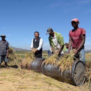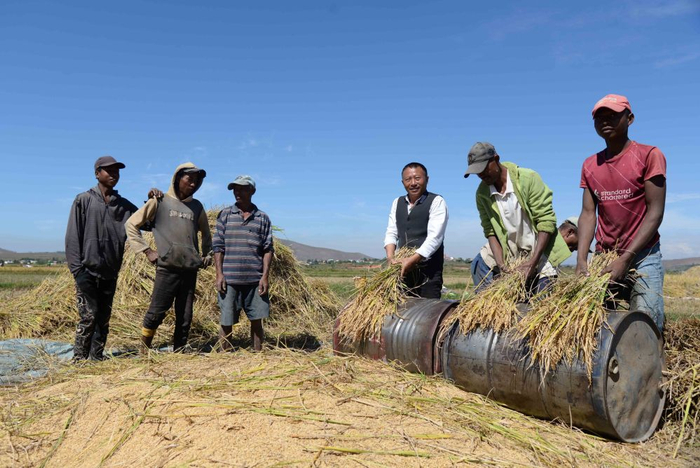 在马达加斯加首都塔那那利佛附近的马义奇镇,中国杂交水稻技术专家胡月舫(右三)在中国国家杂交水稻工程技术研究中心非洲分中心的试验田里和当地农民一起收获水稻(2023年5月12日摄)。新华社发(西塔卡·拉乔纳里松 摄)